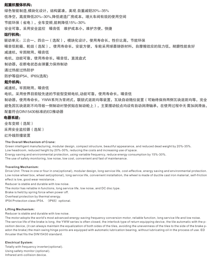 低噪音、免維護(降低檢修時間及維護成本低)(因結構簡單,故配套件品種少,后期方便采購,同時也降低了庫存)。我公司的歐標起重機通過變頻器調速,能有效減少用電量20%-30%,降低了使用成本,提高了使用效率。
